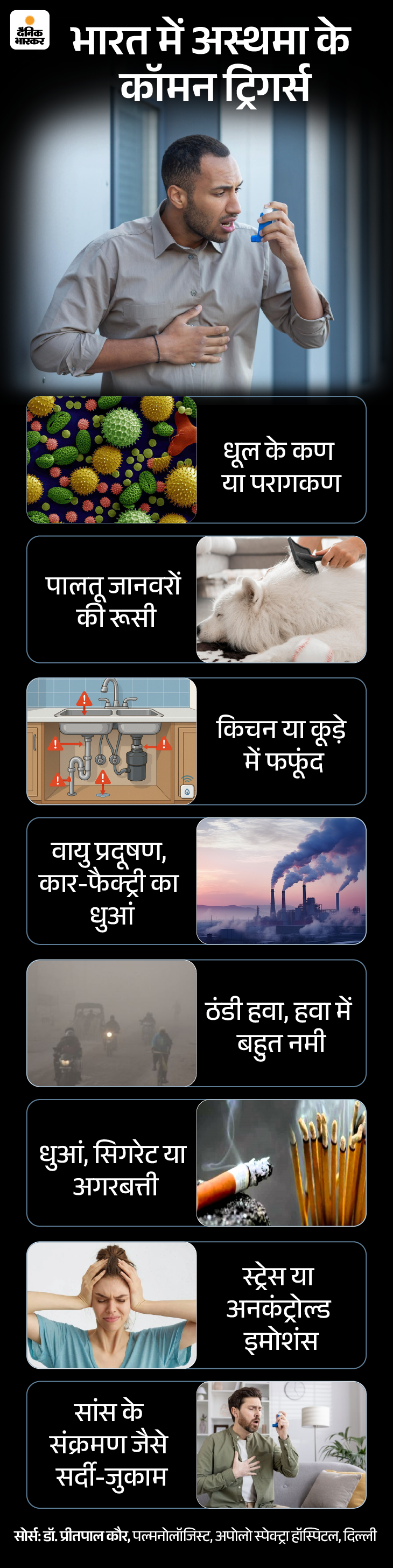 Asthma triggers are different for every individual, but common triggers in India are pollution, dust, polyn, pet dandruff, mold, cold air, exercise, stress and smoke. Avoid smoking or secondhand smoke. When the weather changes, such as cold or moisture, be cautious. If you live in the city where there is more pollution, then wear masks. Keep a diary to notice the triggers- when the symptoms came, what ate or where they went. Check the lungs at home with peak flow meter, which measures the speed of the breath.