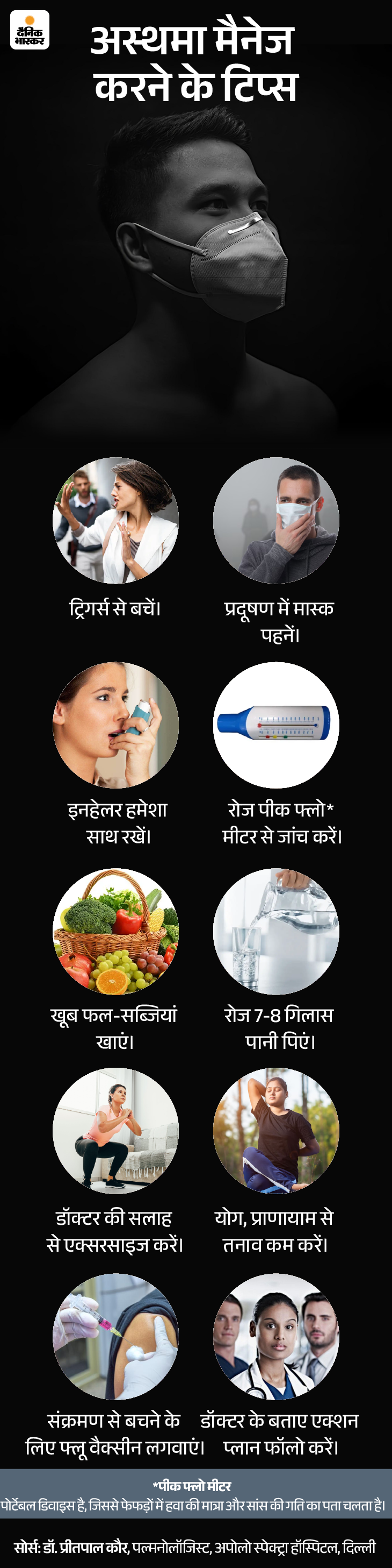 answer: Avoid triggers, take medicines on time. Follow the action plan. If the breath is very flourishing, lips are blue or difficult to speak, then go to the hospital immediately. Adopt healthy habits like exercise, good food and sleep.