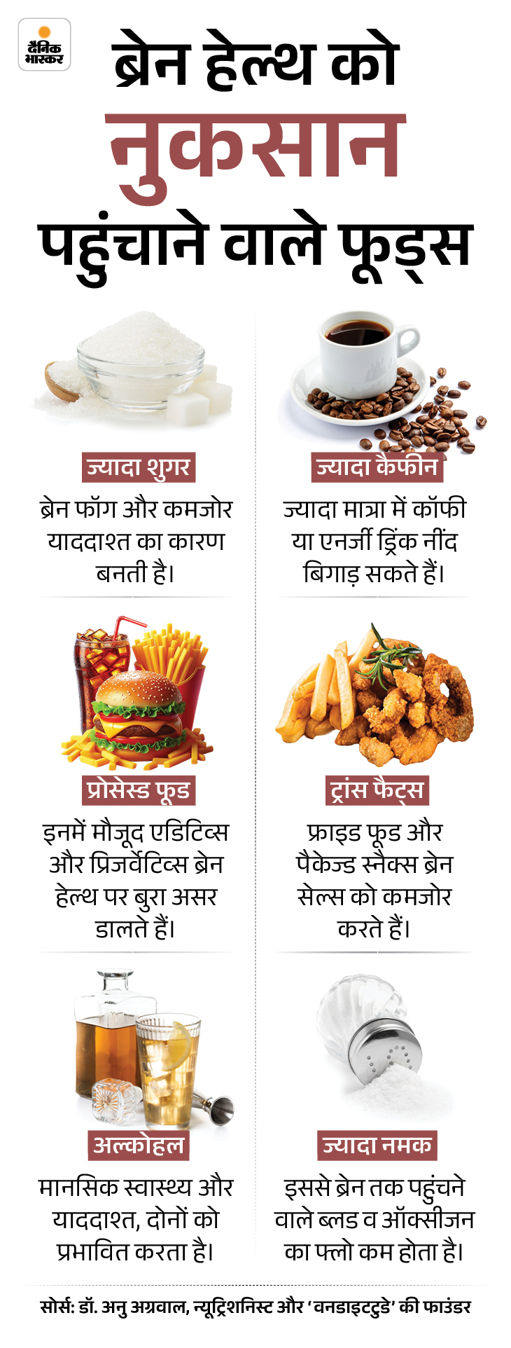 answer- Some food and drink harm brain health. These can gradually weaken memory, meditation and thinking ability. Therefore it is necessary to avoid them.