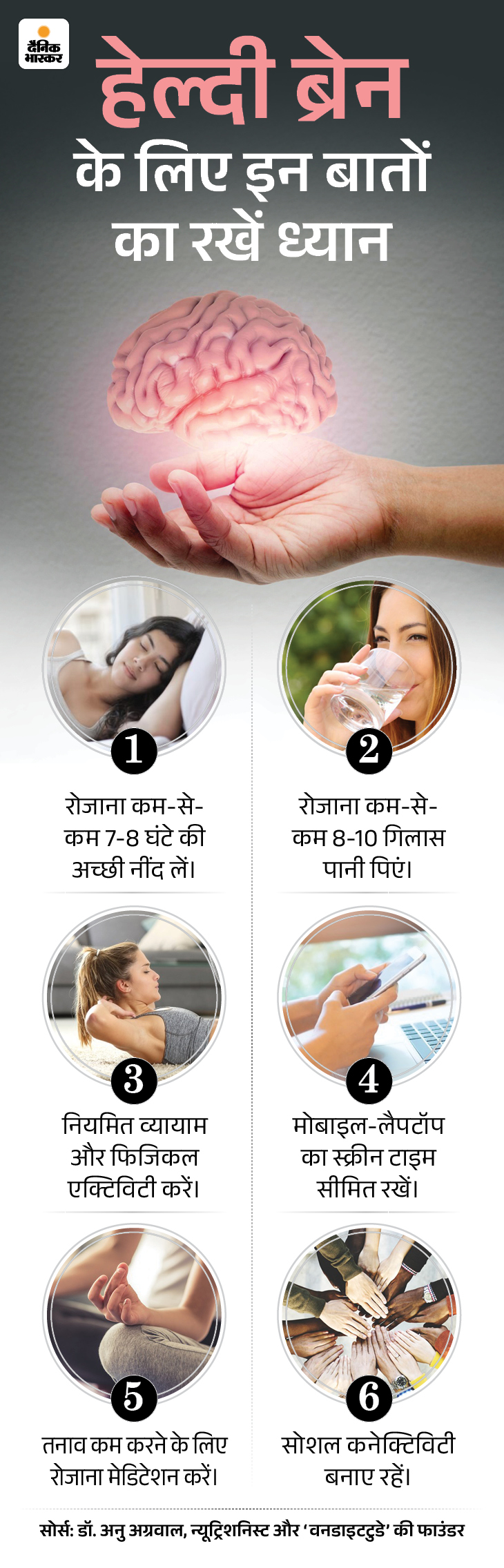 answer- Not only diet, but lifestyle and everyday habits also have a profound effect on brain health. If these things are taken care of, then memory, meditation and thinking ability remains strong for a long time. Understand it from the graphic below-