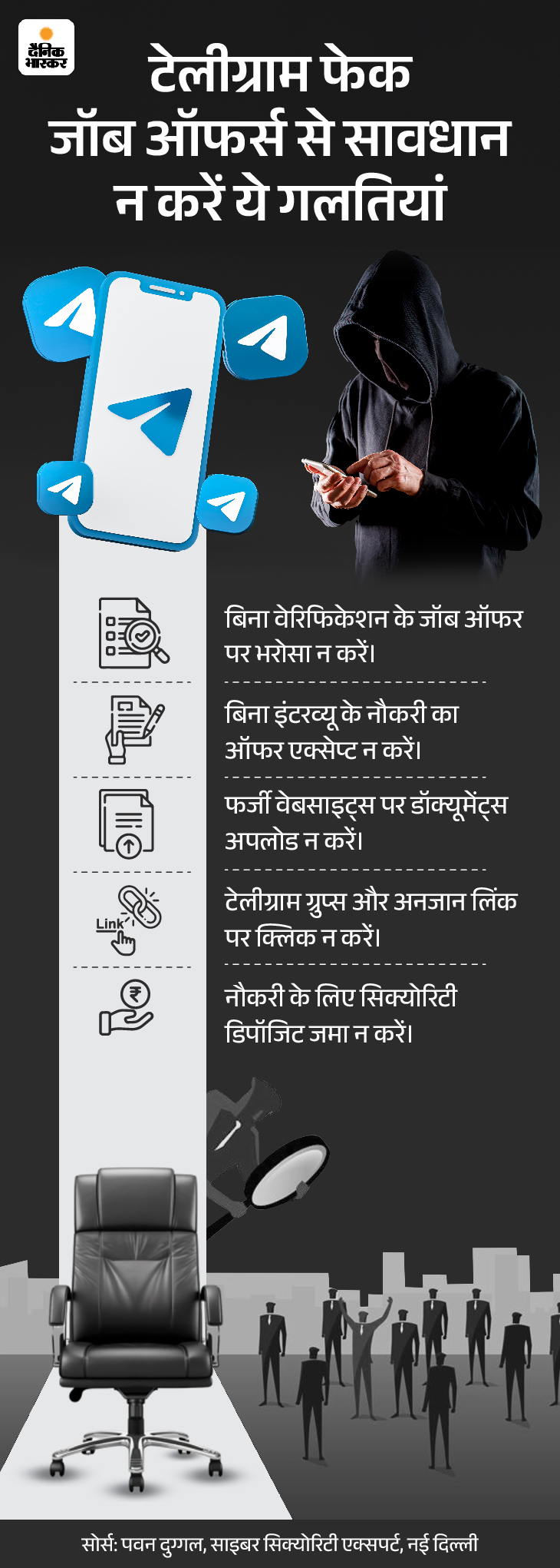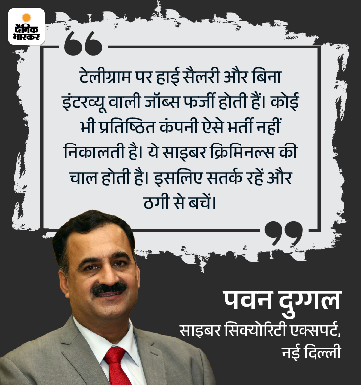 answer- Cyber Security Expert Pawan Duggal explains that Telegram is an online messaging app. Therefore, keep in mind that reputed companies never use Telegram to give jobs. He always puts job advertisements on his official website or reliable platforms like LinkedIn.