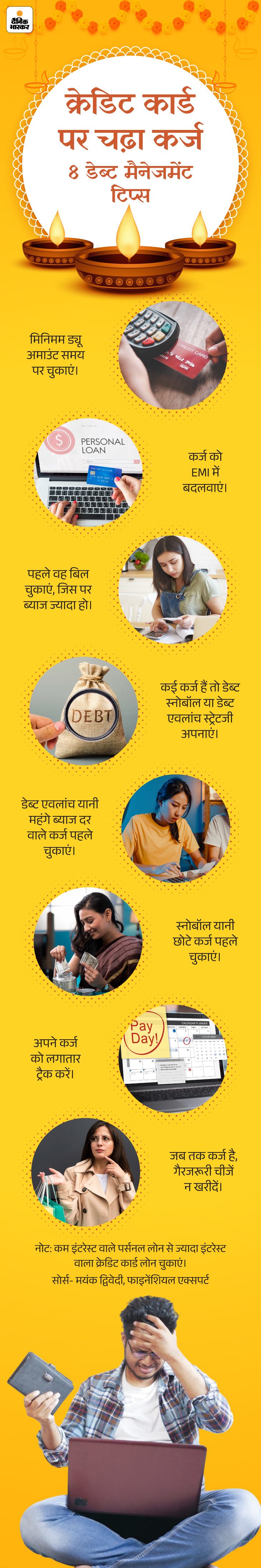 answer- After Diwali, you can adopt some ways to manage credit card bills. For example, to avoid credit card debt, first make a list by writing the expenses of the entire month. It will be clearly visible that where more money is being spent. It is necessary to brake immediately on non-essential expenses. If you get a bonus or any extra income, then use it directly in credit card payment. Set the auto-deduction to cut the bill on time. And if possible, avoid shopping or luxury expenses by next month, so that the debt burden can be reduced quickly.