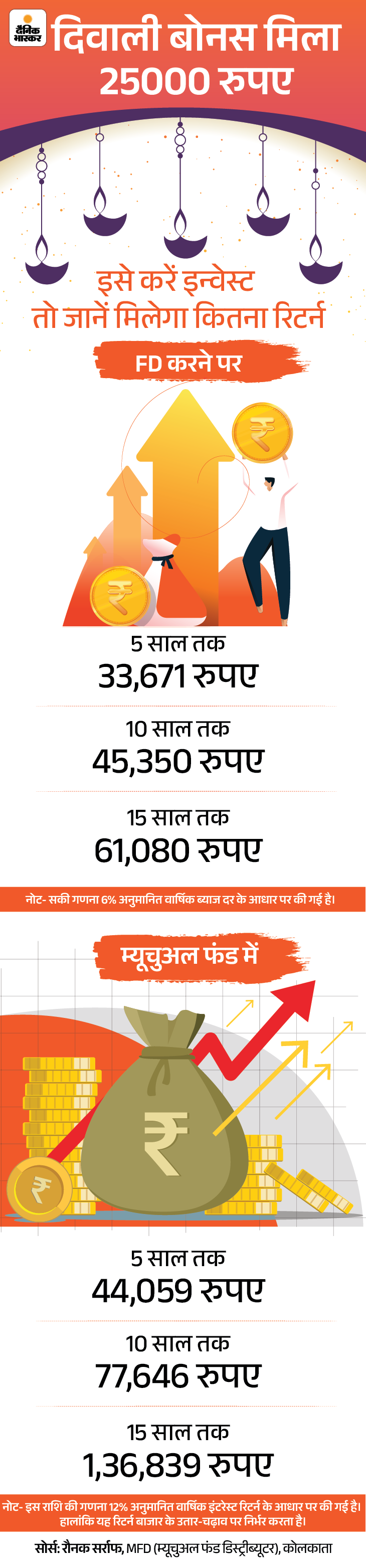 answer- If your bonus is Rs 25,000 and you invest it depends on where you have invested it. Let us understand it through graphic.