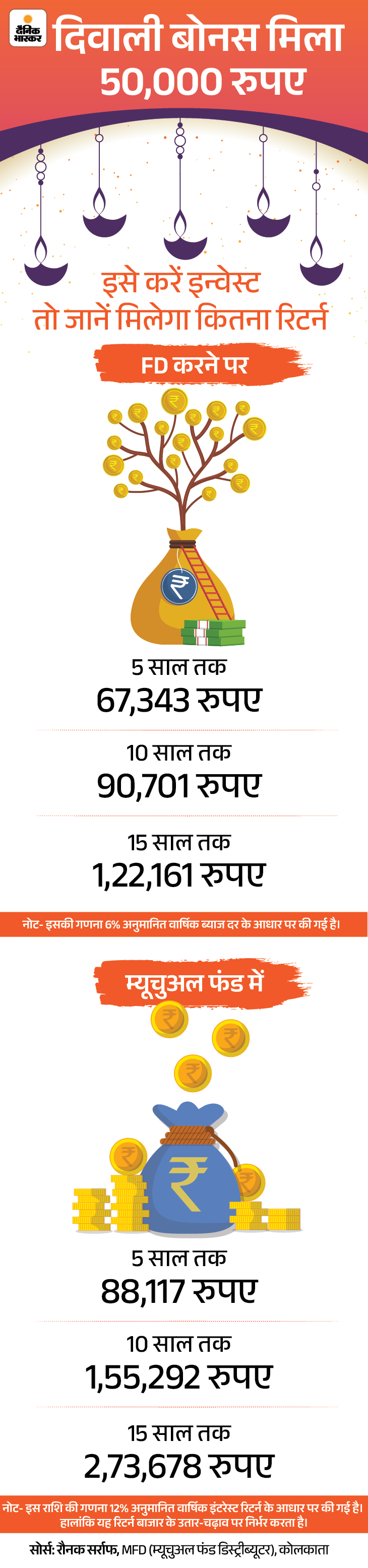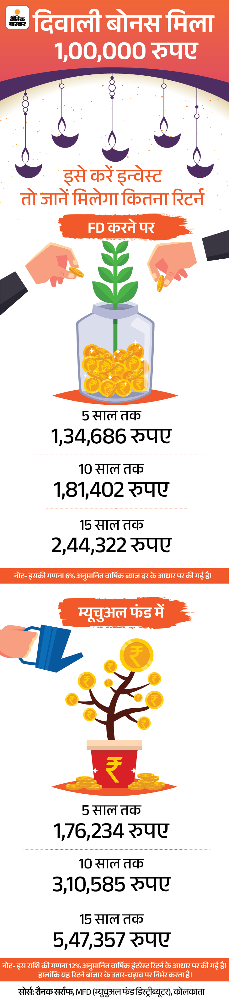 answer- If you make a fixed deposit (FD) or mutual funds of this amount, then the return can vary. Let us understand it through graphic.