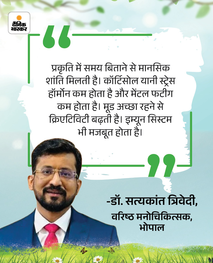Nowadays our life revolves around mobile, computer and TV. In earlier times people were more associated with nature, but now we are away from it. Nevertheless, our brain and body is still deeply connected to nature. Scientists say that by spending at least 120 minutes a week in greenery, our health improves and mental health also improves.