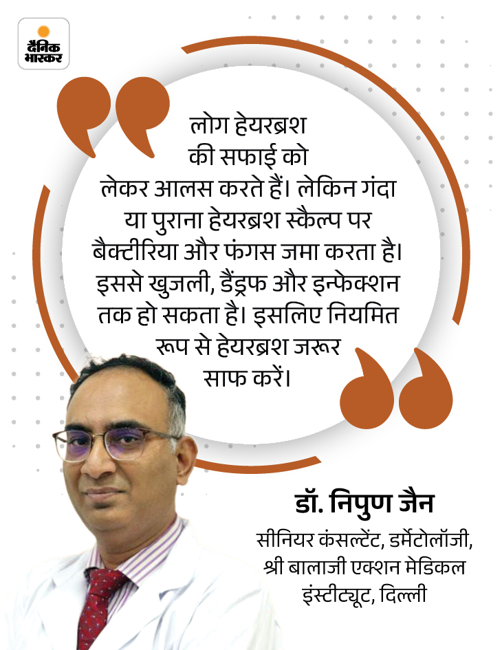 answer- When we comb the hair, the hairbrush collects the remains of dead skin cells, natural oil and styling products from the scalp. Over time, this brush becomes a favorable environment for bacteria and yeast to flourish. When we use it, all these elements go back to the scalp, which can cause irritation, itching and many other problems. Understand it from the graphic below-