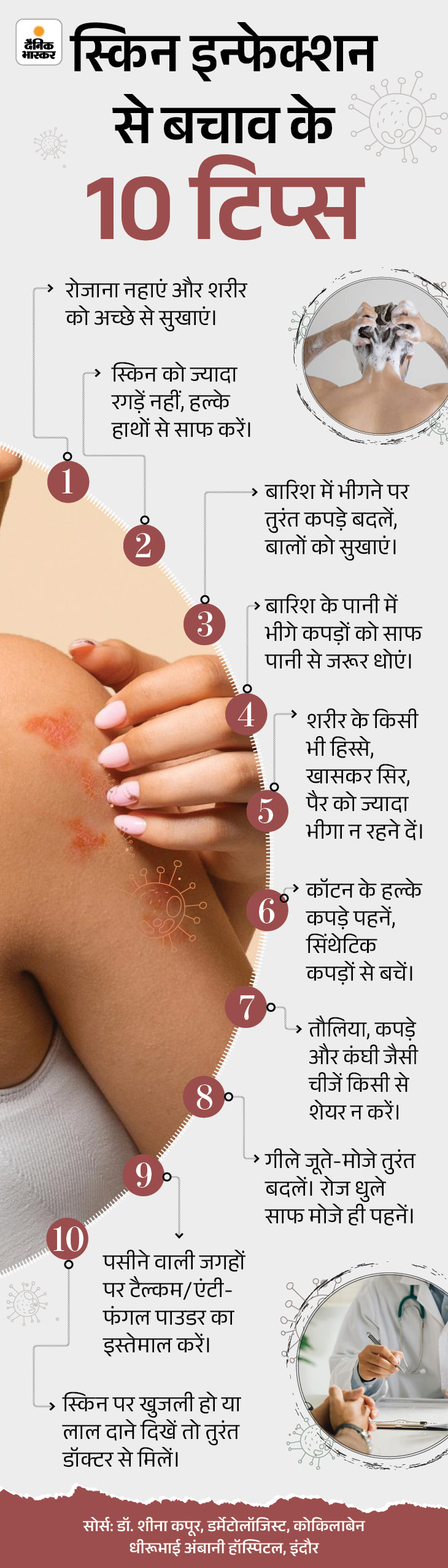 answer- Skin infection gets quickly due to continuous moisture and sweating in the rain. So always keep the skin clean and dry. After bathing, wipe the body well. Change wet or sweaty clothes immediately and wear light clothes like cotton. With these easy habits you can protect the skin in the monsoon.