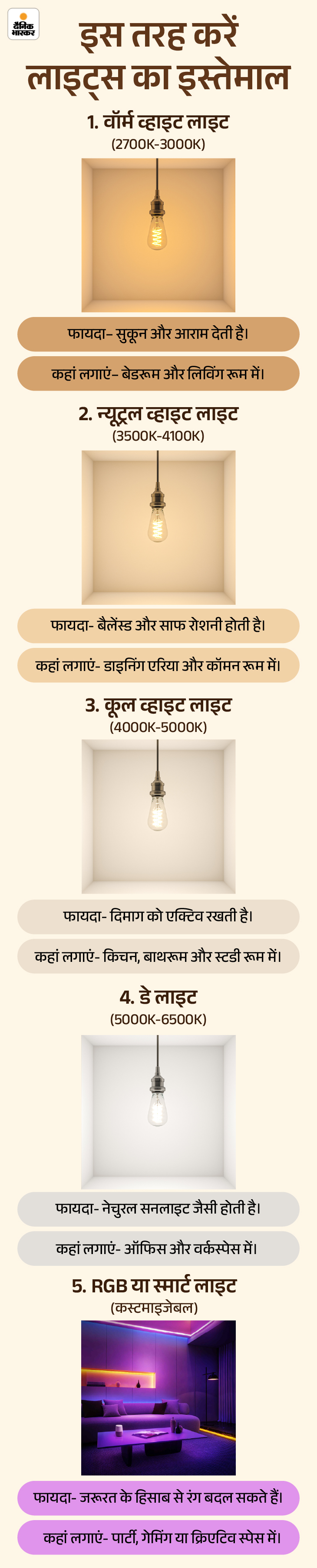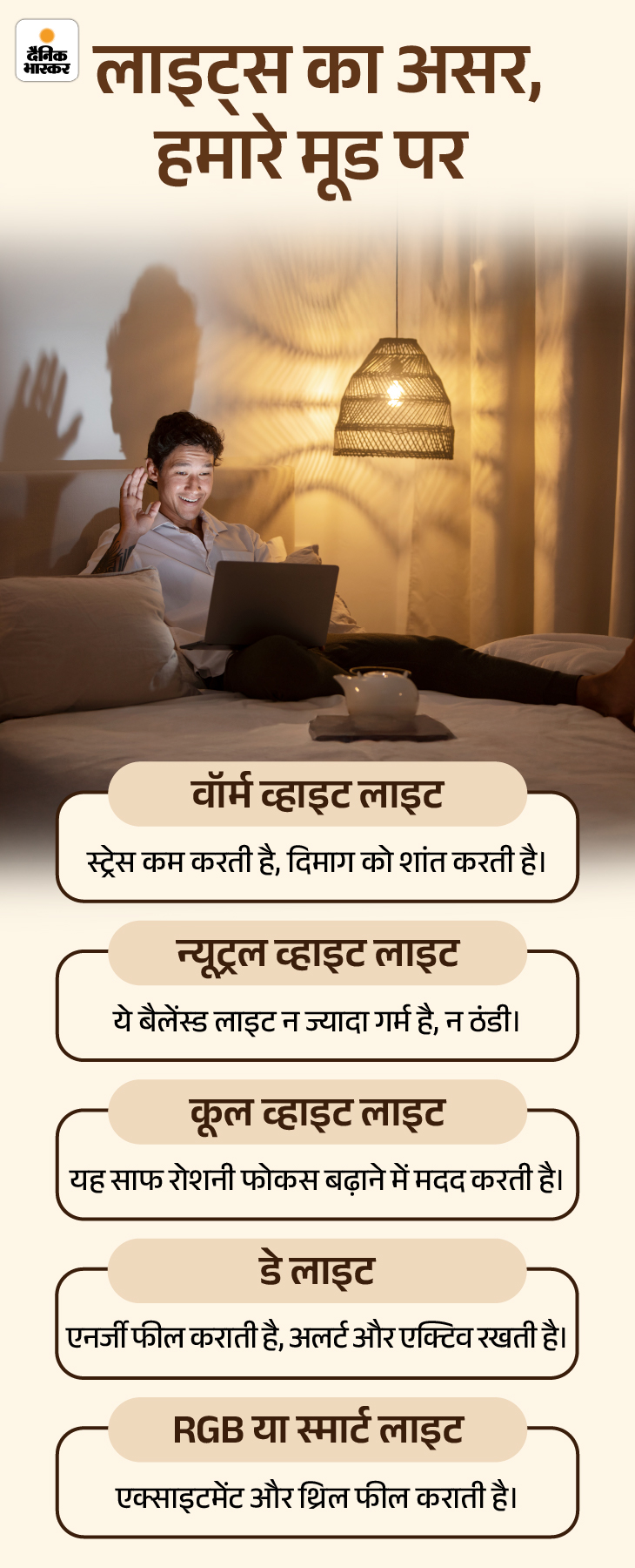 answer- Different types of lights have different effects on our mood. We humans are accustomed to sunlight i.e. yellow (warm light). In such a situation, we get more relaxed in these lights. Let us understand their effects through graphic.