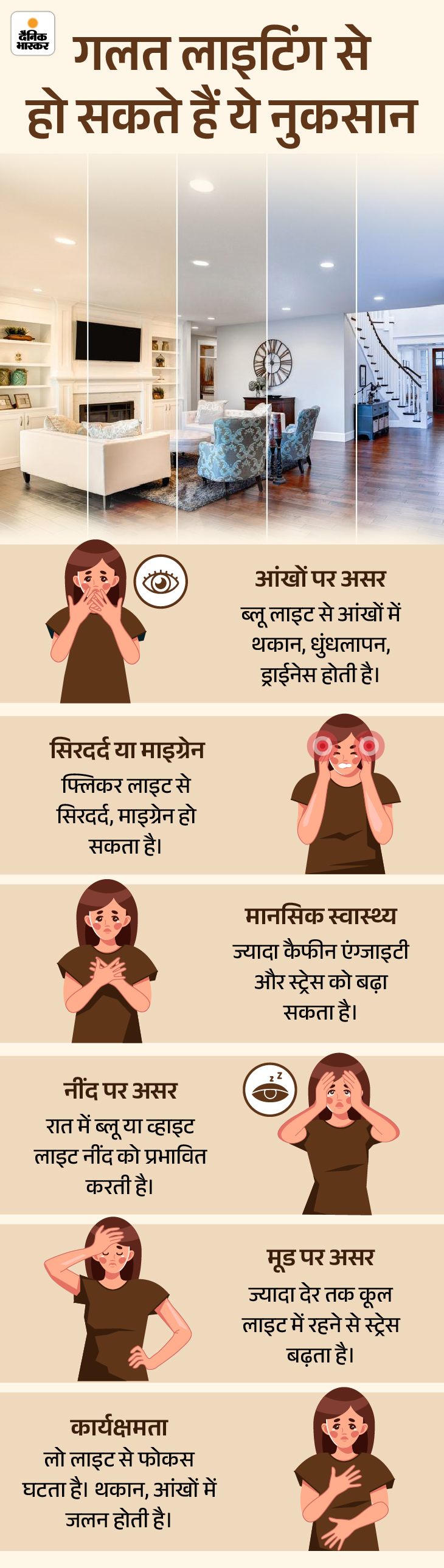 If a room has excessive or very light light, or the light color (temperature) is uncomfortable for the eyes, it can cause eye irritation, fatigue and headache. Let us understand it through graphic.