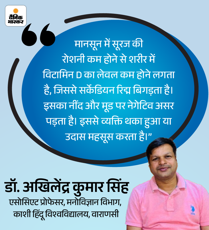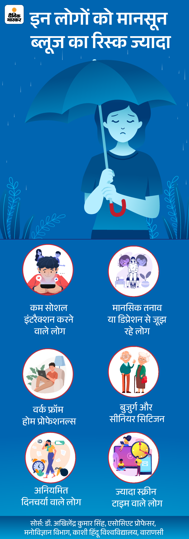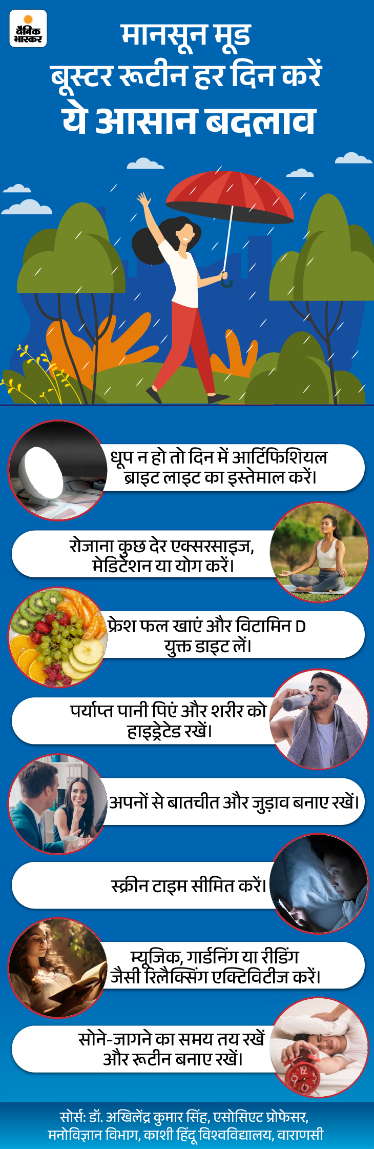 answer- Associate Professor Dr. Akhilendra Kumar Singh says that to avoid monsoon blues, it is necessary that you start your day in a positive and active way. In this season, the body needs more light, movement and social connections. Light exercise, nutritious food and interaction with loved ones help to maintain mood stable and better. Also avoid digital overload and spend time in activities that keep yourself calm and balanced. Below are some points in the graphic, you can follow them.