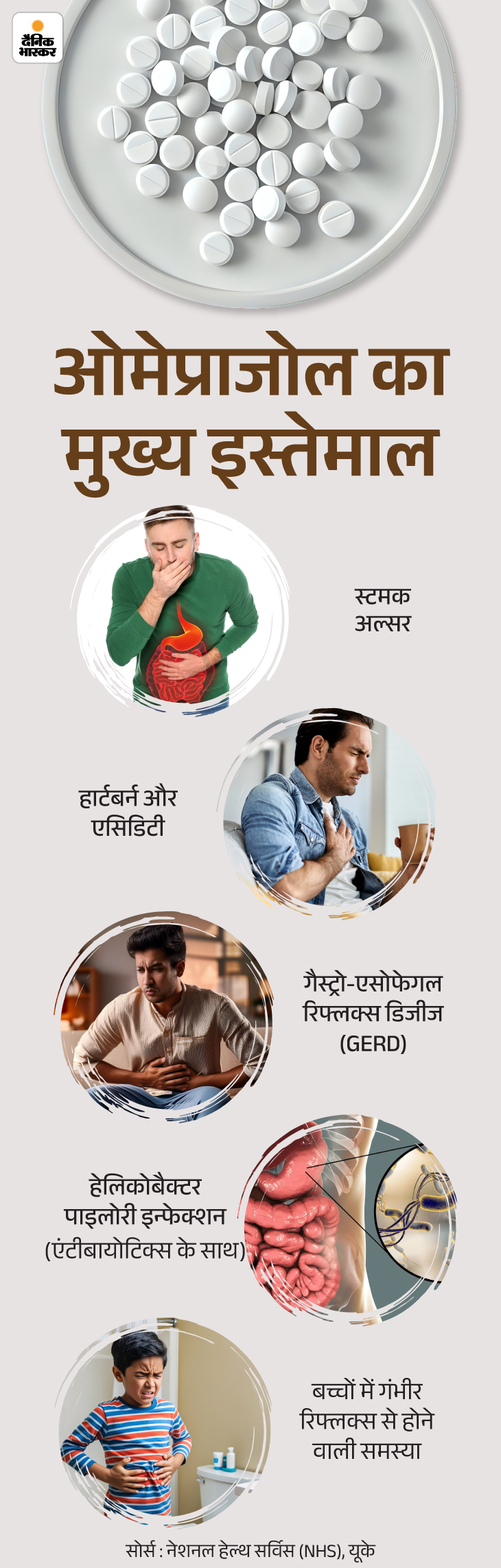 This drug does not neutralize stomach acid, but only prevents its production. Therefore it helps in healing ulcers and protects the food pipe from reflux. But it suppresses the symptoms, not solving the root of the problem. If there is acidity due to diet or lifestyle, changes with medicine are necessary. Therefore, taking it without prescription can be harmful. Understand the main use of Omeprajol from the graphic below-